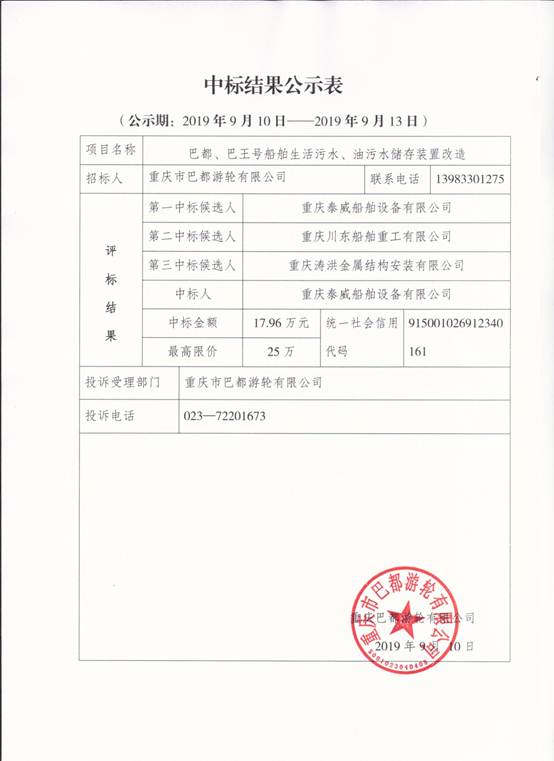 重庆市巴都游轮有限公司 “巴都、巴王号”游船污水储存装置改造项目竞争性比选中标结果公示表
