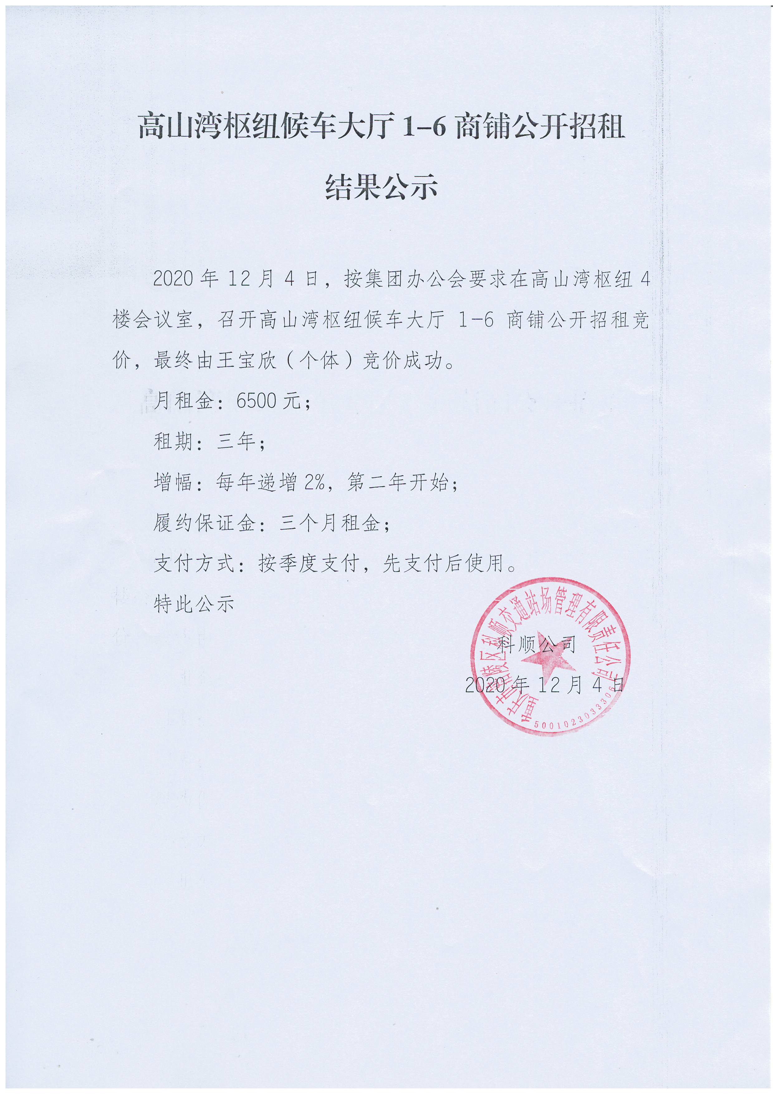 高山湾枢纽候车大厅1-6商铺公开招租结果公示