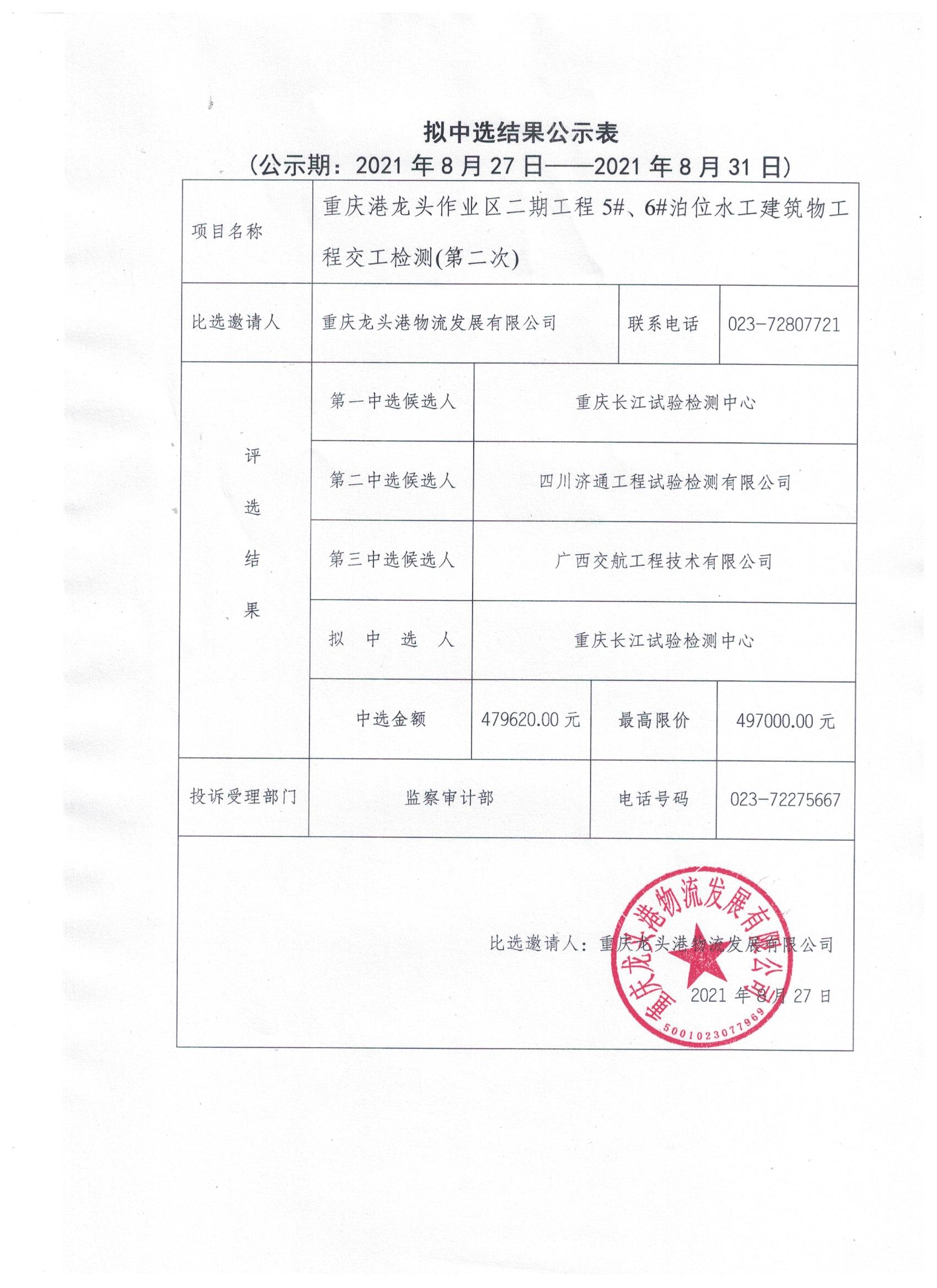 重庆港龙头作业区二期工程5_、6_泊位水工建筑物工程交工检测(第二次)比选结果公示