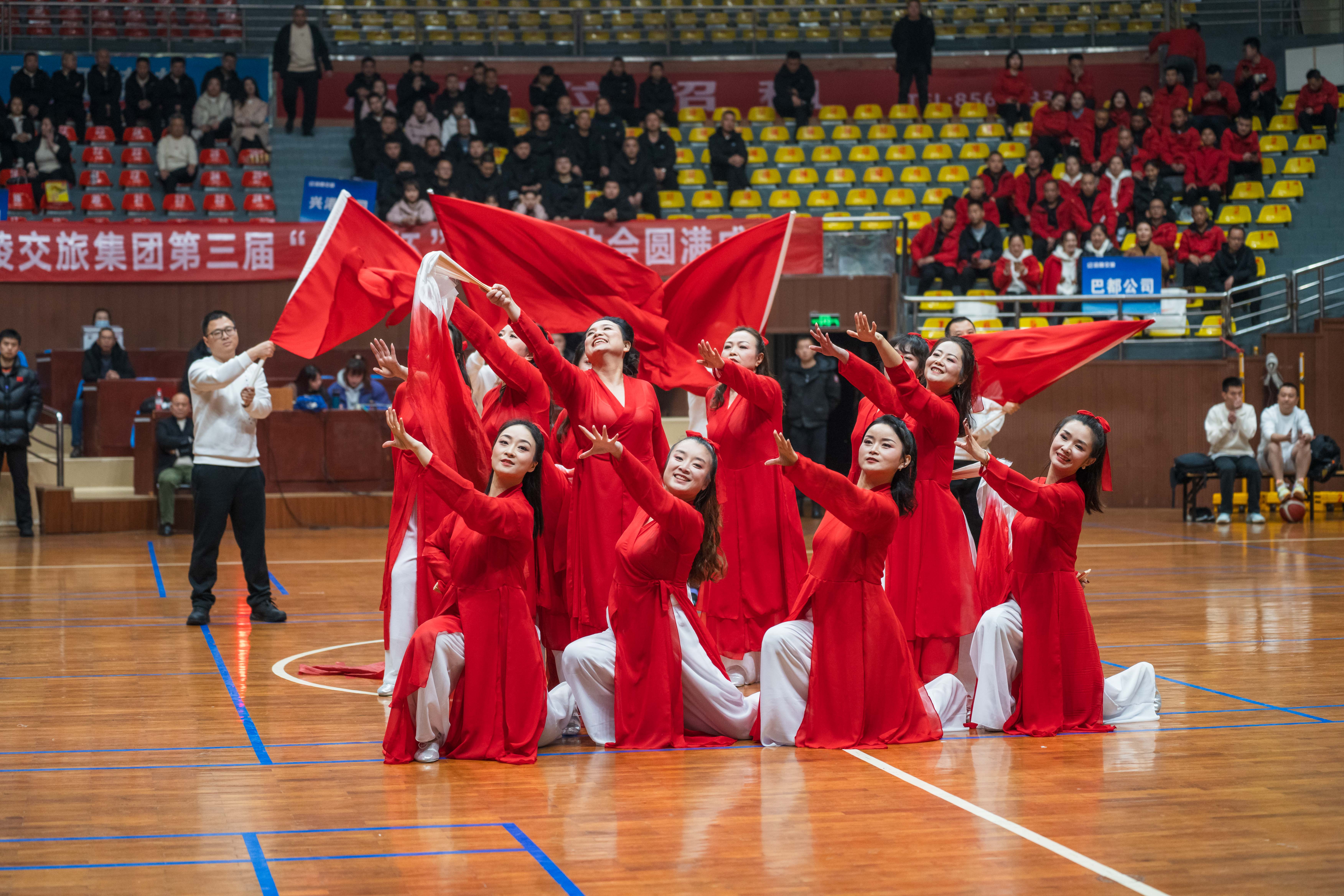运动员相聚于涪陵体育馆,分享属于他们的体育运动盛宴。欢快的乐曲声中,各参赛代表队伍迈着整齐划一、铿锵有力的步伐走向主席台。健身舞蹈《红旗飘飘》将先行者的热血、勇气,交旅人的奋进、热情等画面一一呈现,书法太极剑表演凝结着“弘扬体育精神,谱写交旅新篇”的美好愿景,为观众们带来了一场视觉与精神的盛宴。
